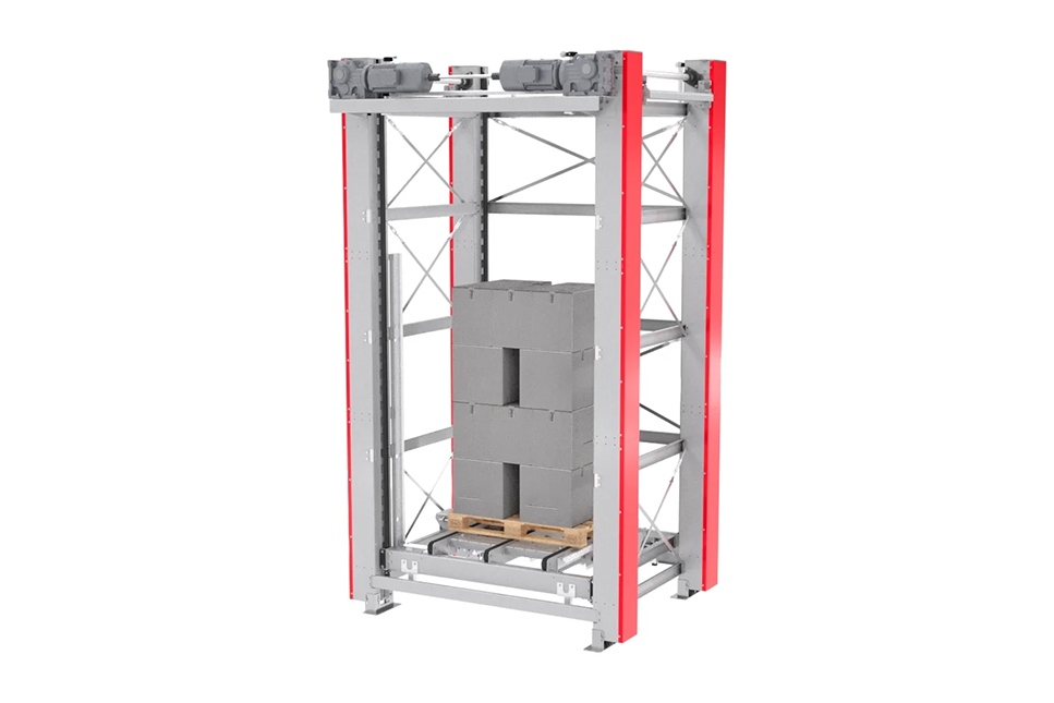 A vertical lifter is a mechanical solution used to move goods between different floor levels or heights in a facility. It optimizes vertical space usage and is essential in multi-story warehouses or production lines with elevation changes.